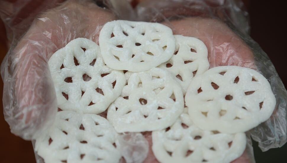 做糖环看似简单,其实要用巧劲。弟姨一边做一边讲解,糖环主要用糯米粉、白砂糖和水做成,为了保持原汁原味,不能添加其他东西。先煮糯米粉,然后把生、熟粉和在一起,搓成面团,这个过程约需20分钟。和好糯米面团后,将面团印在木头模具上,这时候需要巧劲,用刀薄薄地切下一层,一个约三四毫米厚、有9个孔的糖环就做出来了。