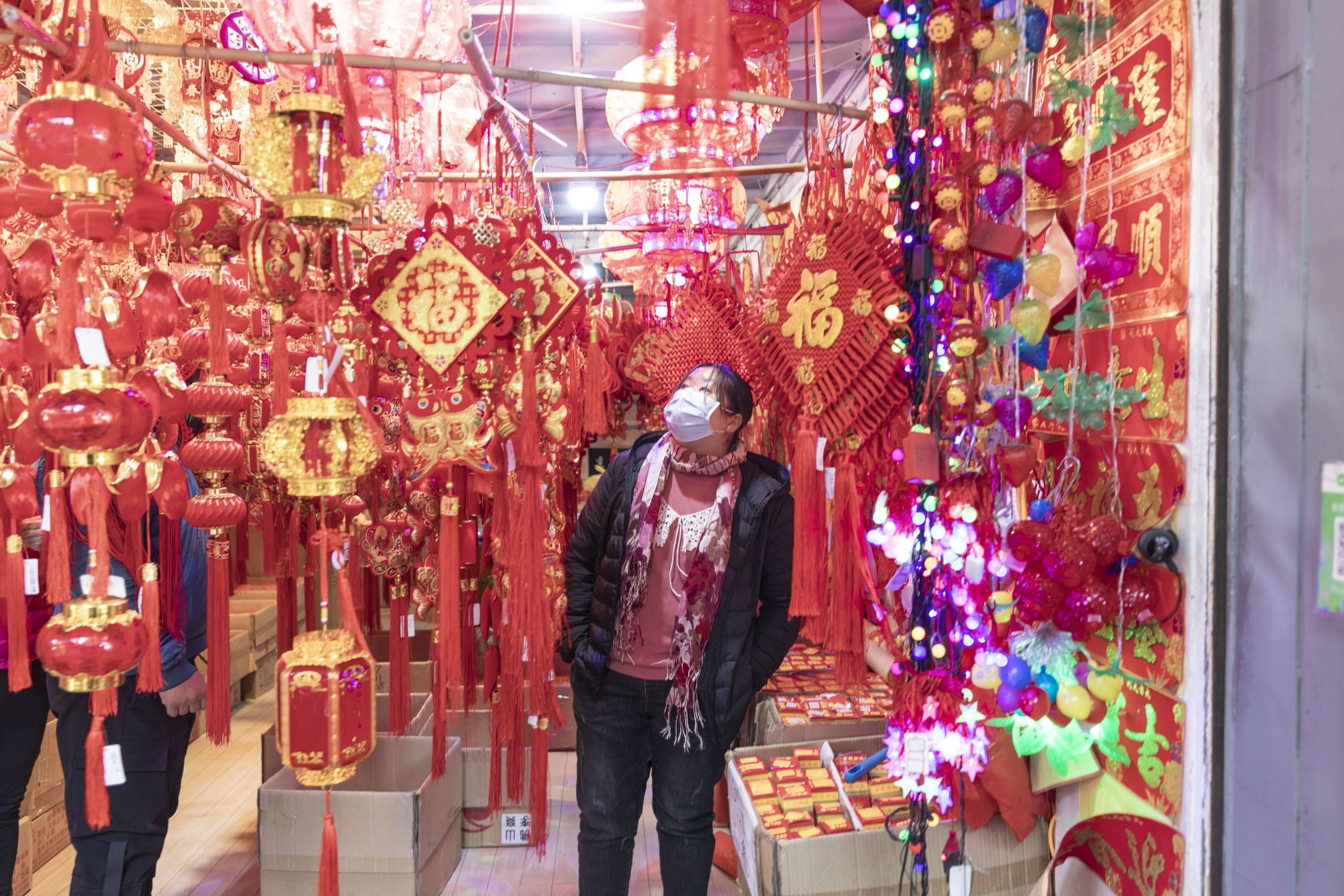 禅城区松风路上,市民正在挑选春节装饰品。(摄影:王伟楠)