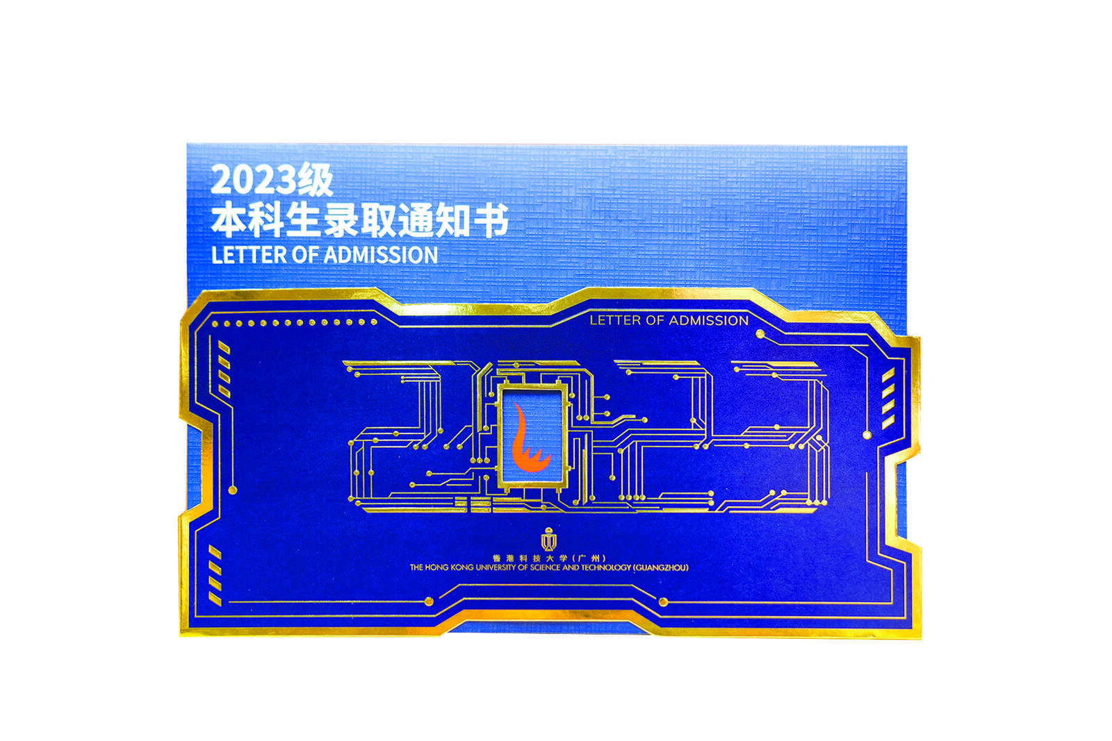 港科大(广州)首届本科生录取通知书设计延续了香港科技大学标志性的蓝色与金色,命名为《初见》,既是学校与新生最初的联结,也呼应着学校对首届本科学子的偏爱与期待。打开通知书礼盒后,学子亲自动手后即可完整呈现红鸟广场等元素,颇具观赏性。