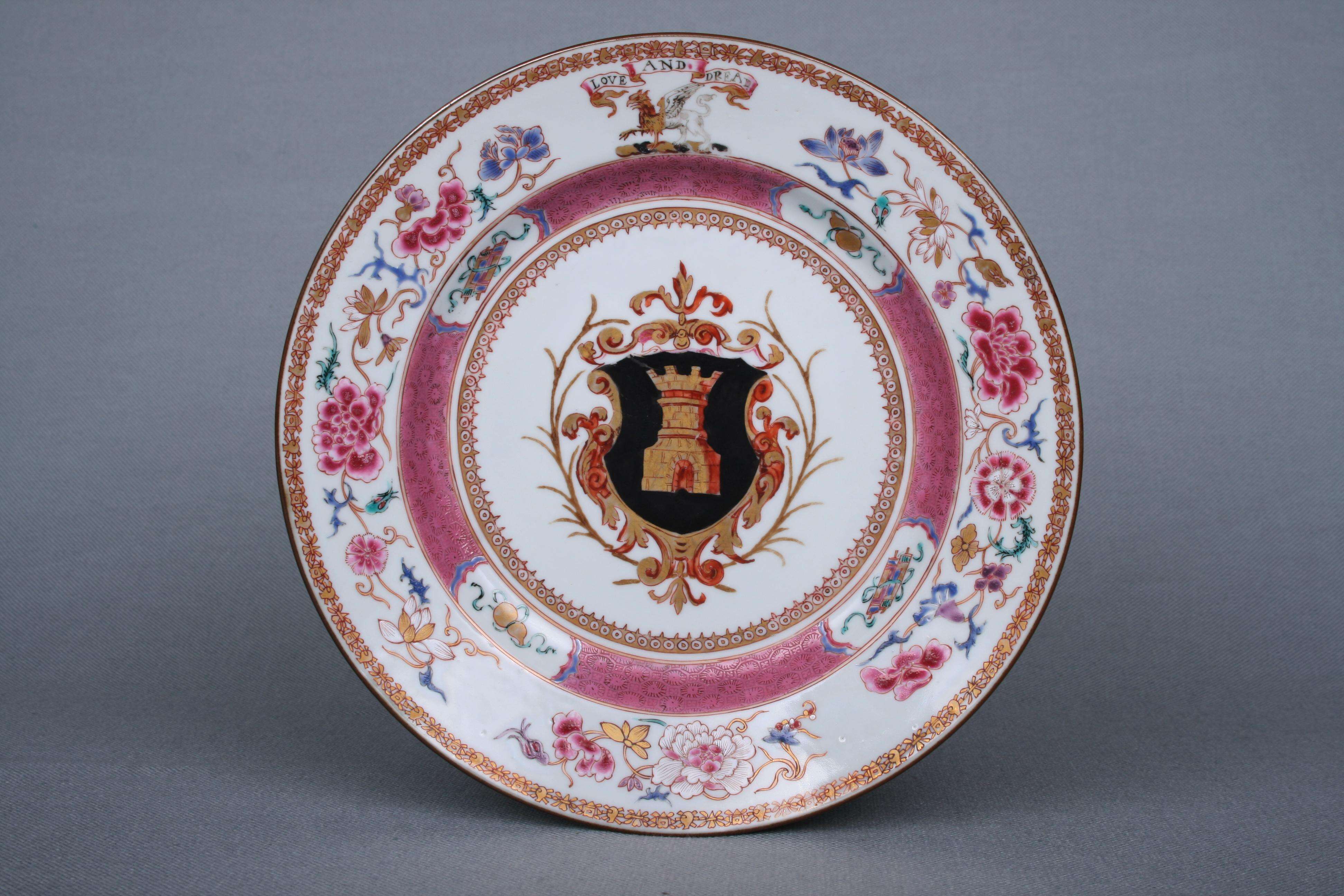 “Tower纹章盘”盘心位置绘有塔楼(英文即“Tower”)图案,是1728年英国涛尔家族在中国定制的,也是目前存世的唯一一件拥有中文标注原始订单的纹章瓷。“盘沿上的缠枝花卉是广彩作品中的常见元素,描金手法让整个盘子显得富丽堂皇。”
