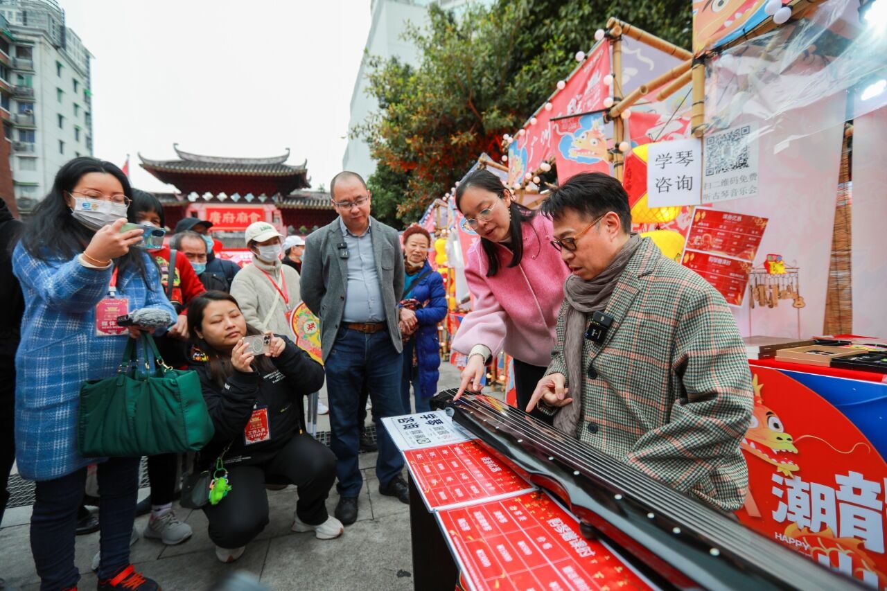人群熙攘的广场上,突然传来一阵悠扬的古琴声。走近一看,琴声来自广府庙会打造的“潮龙出墟”市集,一位非遗传承人正在摊位演奏岭南古琴。沿街游览,许多年轻人正打卡了解竹、布、灯笼等传统非遗项目。这是记者在广州越秀城隍庙看到的场景。