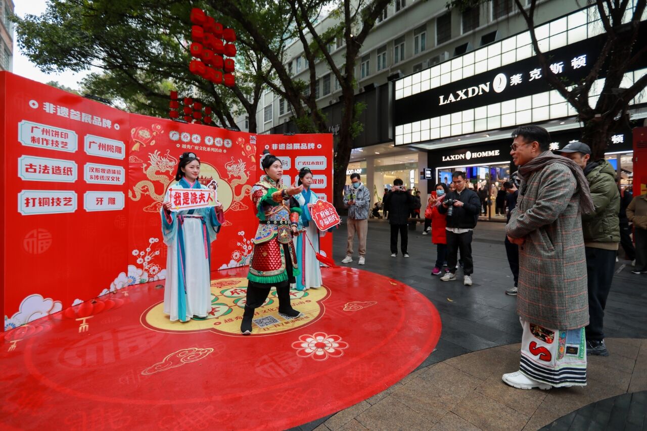 今年,广州非遗街区(北京路)以越秀区国家级非遗春节“行花街”为内核,举办“行花街 迎春福 叹年味”主题展览和非遗体验,展示广彩、玉雕、广府手钩花、漆画等2023年第八届广东省非物质文化遗产创意设计大赛优秀作品。当天,本届广府庙会青年喜剧节精彩上演,风格各异,极具代表性的作品获得掌声一片。