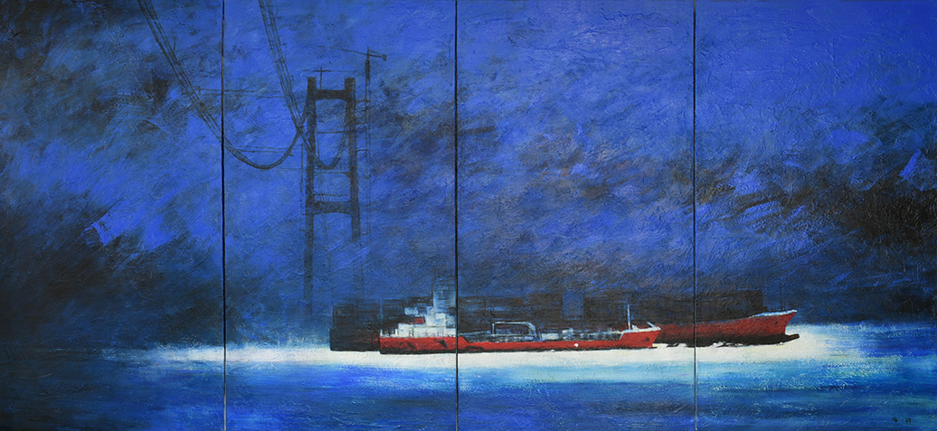 以艺术铭刻时代,工业与风景的诗意交融。陈许的创作生涯始终与大国工程紧密相连。继港珠澳大桥主题油画展后,他再度聚焦深中通道,历时七年,创作了32幅油画作品。这些作品以深中通道从开建到贯通的历程为轴线,以多维视角记录这一建设史诗,既有全景式的恢弘联幅,也有聚焦细节的局部特写。例如,《湾区巨龙》以俯瞰视角呈现跨海长桥的蜿蜒壮美,《匠人匠心》则通过工人在高空作业的瞬间,呈现人力与自然博弈的震撼。画面中,浓烈的红色象征建设者的激情,明快的黄色勾勒机械的力量,纯净的蓝色映衬海洋的深邃,天空、风浪、云烟与钢铁巨构交织,形成独特的工业美学景观。吊机巍然高耸、桥墩破浪而立、船舶磐峙雄踞……这些元素在陈许笔下不再是冰冷的工业符号,而是充满生命力的艺术意象,既展现了大国重器的雄浑气魄,也传递出工匠精神的细腻温度。