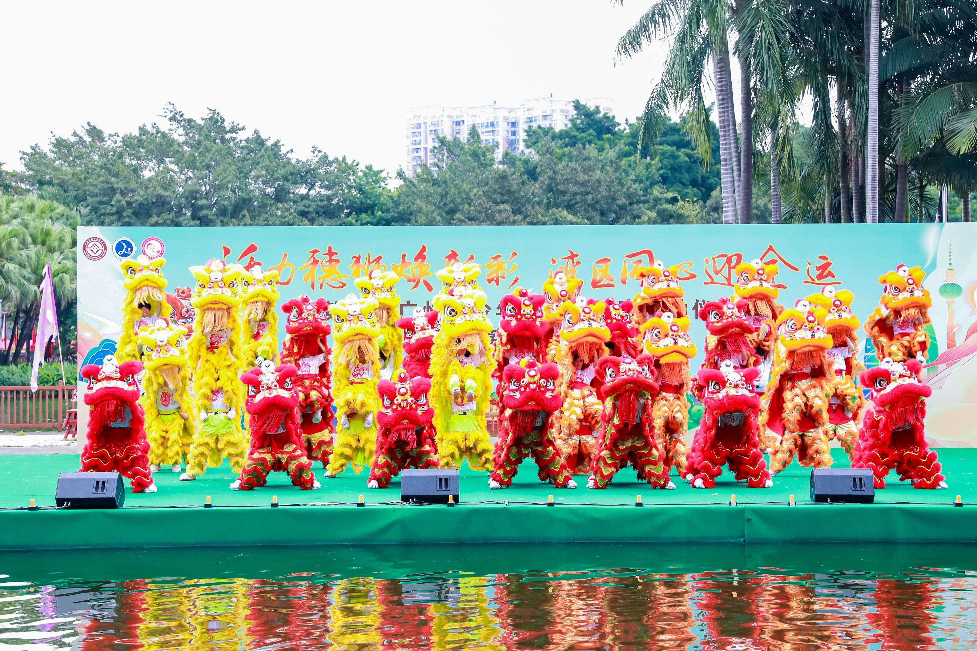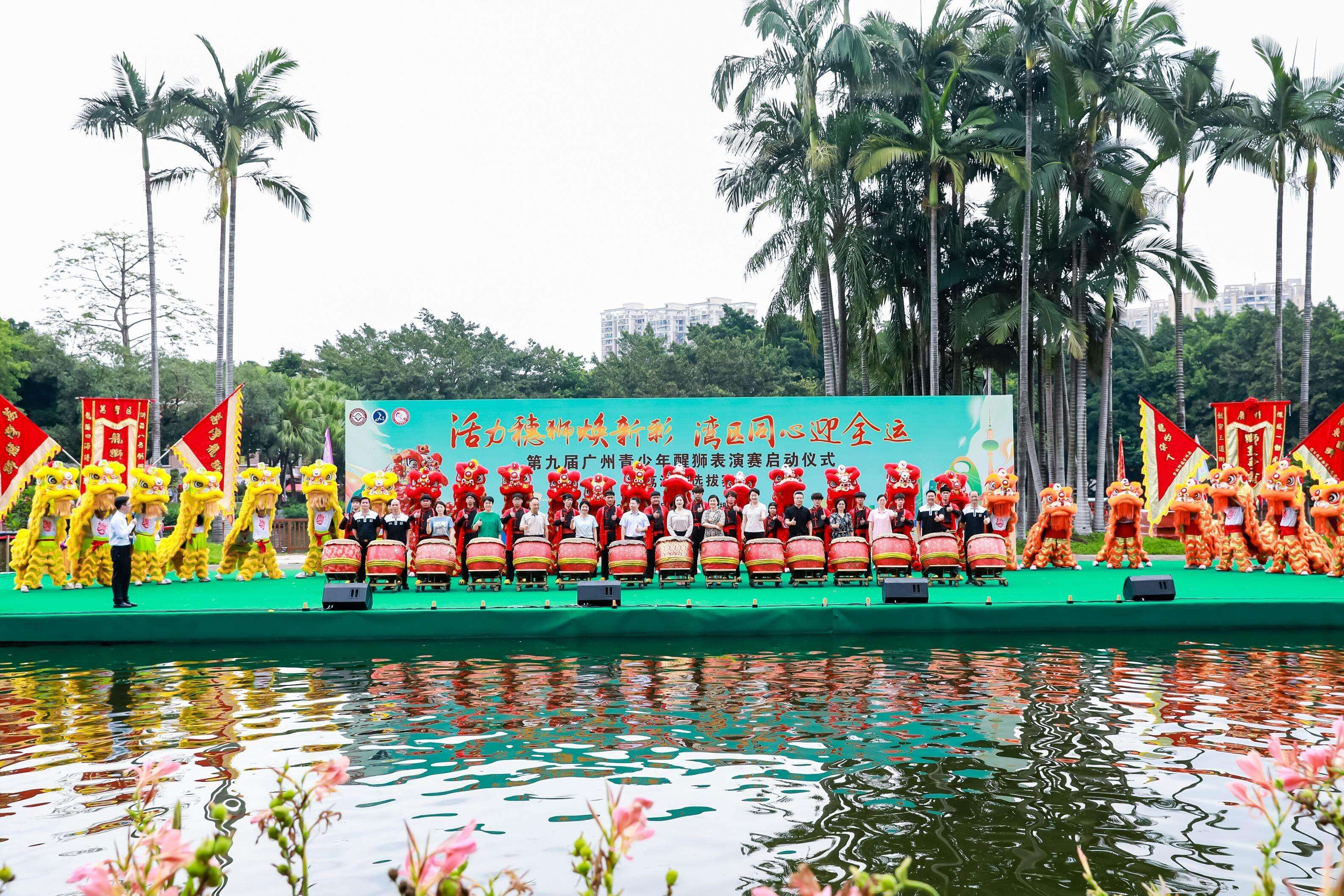 6月2日,第九届广州青少年醒狮表演赛在荔湾湖公园水上舞台火热开赛!启动仪式上,56位来自粤港澳大湾区的学子舞动28头醒狮,摆出“十五”字样,象征着56个民族紧密团结,共同迎接“十五运”的到来。