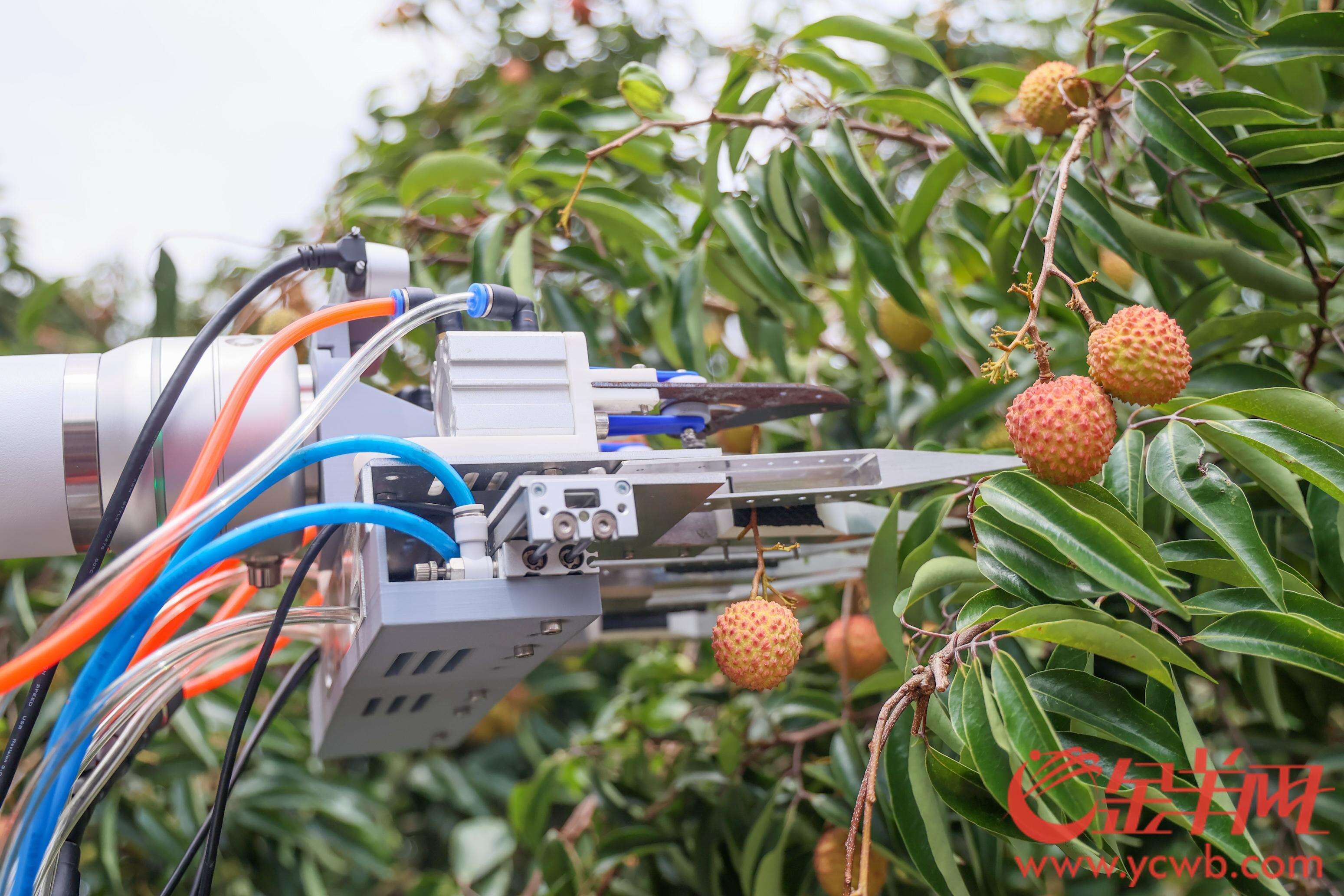 荔枝园内,一台履带式机器人缓缓来到了一棵荔枝树下,伸出前端的机械爪,准确地“抓住”荔枝枝条,将成熟的荔枝果“摘下”。谁能想到,在无数古诗词中出现的“岭南佳果”如今正奏响着现代技术的新乐章。