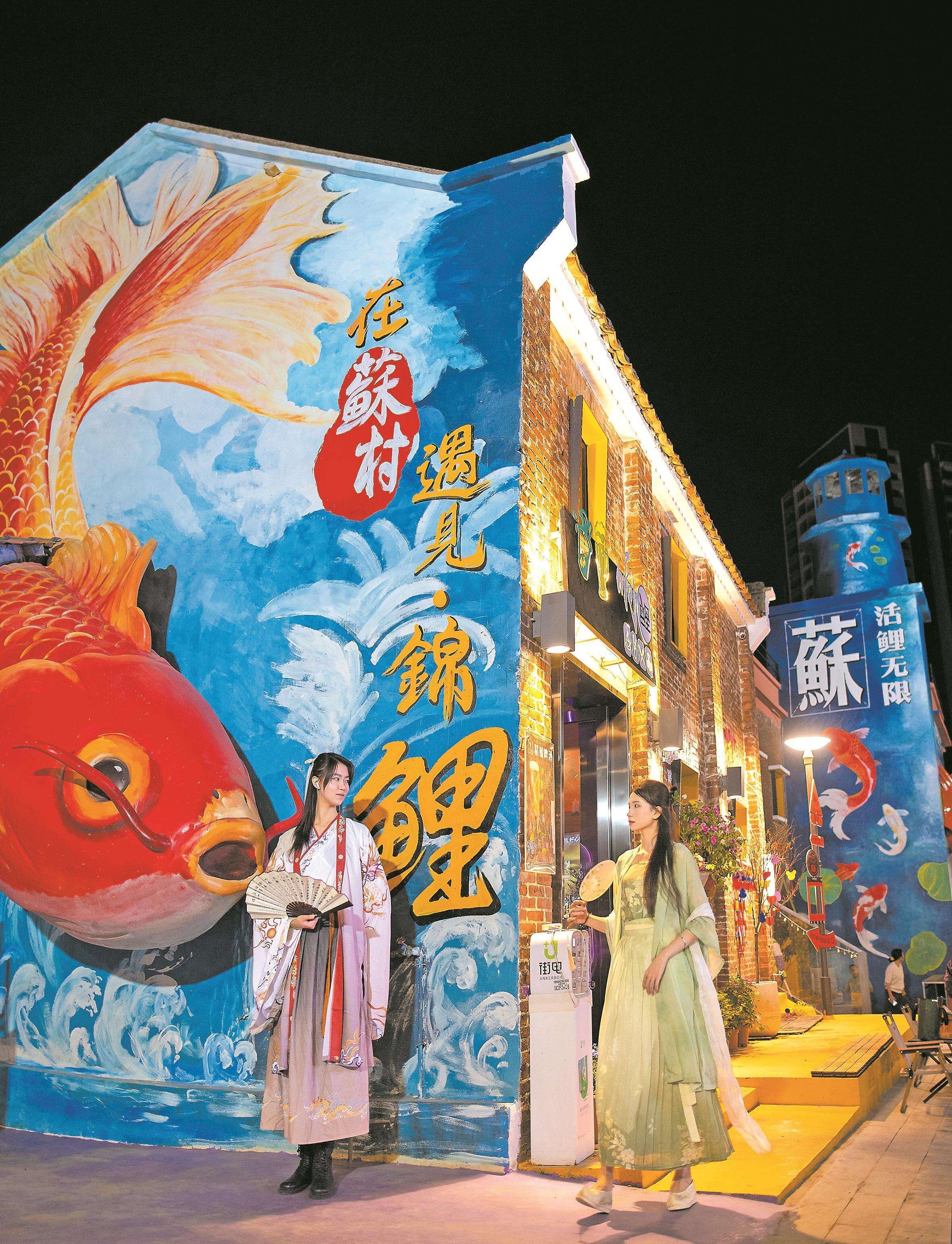 团队匠心创设“开运鲤”“青云鲤”“文昌鲤”等七种文化形象,赋予每条街巷独特文化符号。昔日斑驳的农房外立面,如今披上“锦鲤红”“锦鲤黄”的华彩,191栋建筑(占比超95%)化身巨鱼“鳞片”,形成“鱼头-鱼身-鱼肚”的震撼动态景观。21米“龙柱”矗立江岸,金鲤溯游化龙;12米水车立于池中,转动“风生水起”的吉兆;七座锦鲤池与IP形象交相辉映。