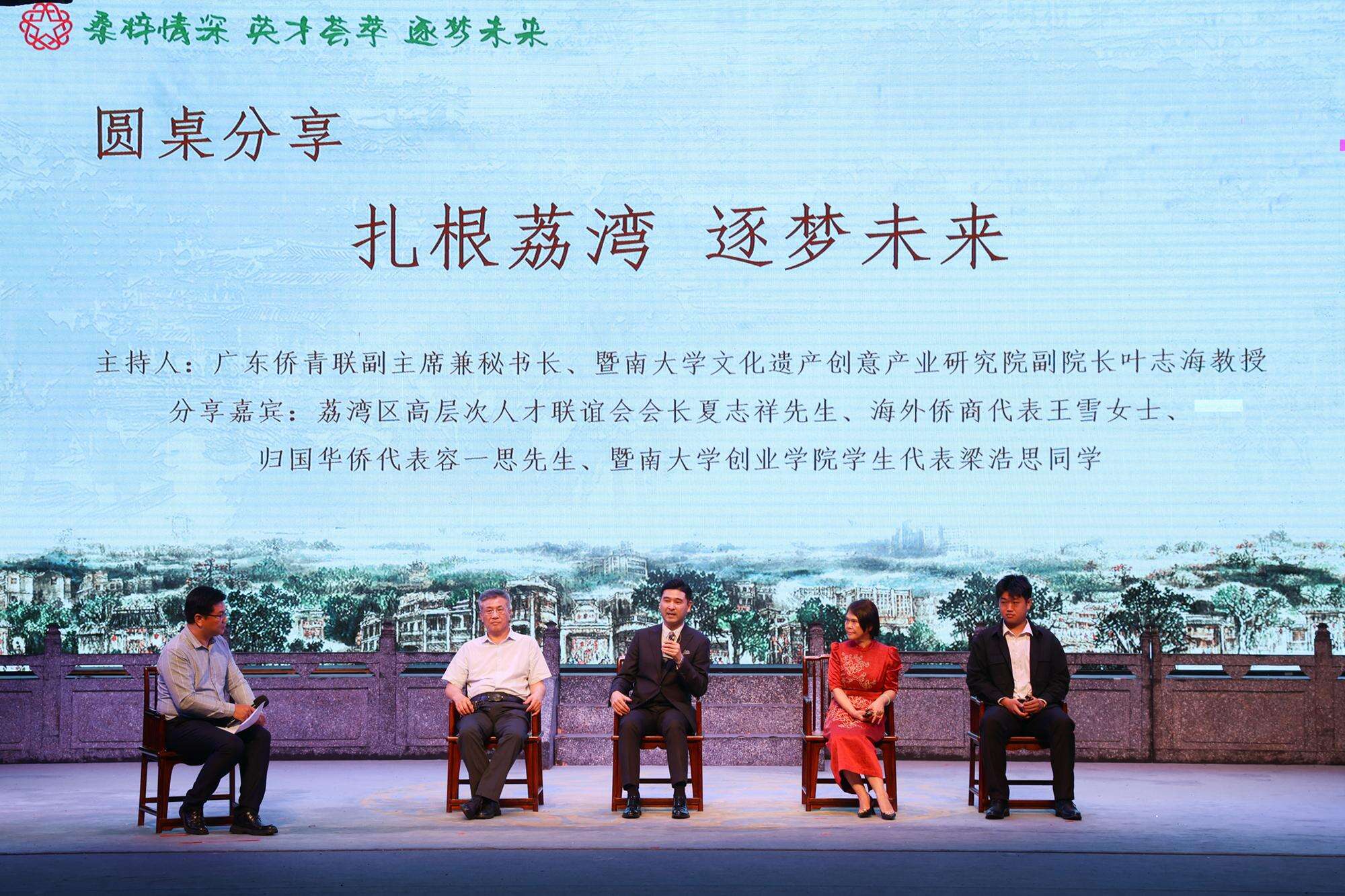 在圆桌分享会上,广东侨青联副主席兼秘书长、暨南大学文化遗产创意产业研究院副院长叶志海,荔湾区高层次人才联谊会会长夏志祥,海外侨商代表王雪,归国华侨代表容一思,与暨南大学创业学院学生代表梁浩思展开主题交流,从不同维度分享他们的见解,给新侨人才创新创业带来更多启发和灵感。
