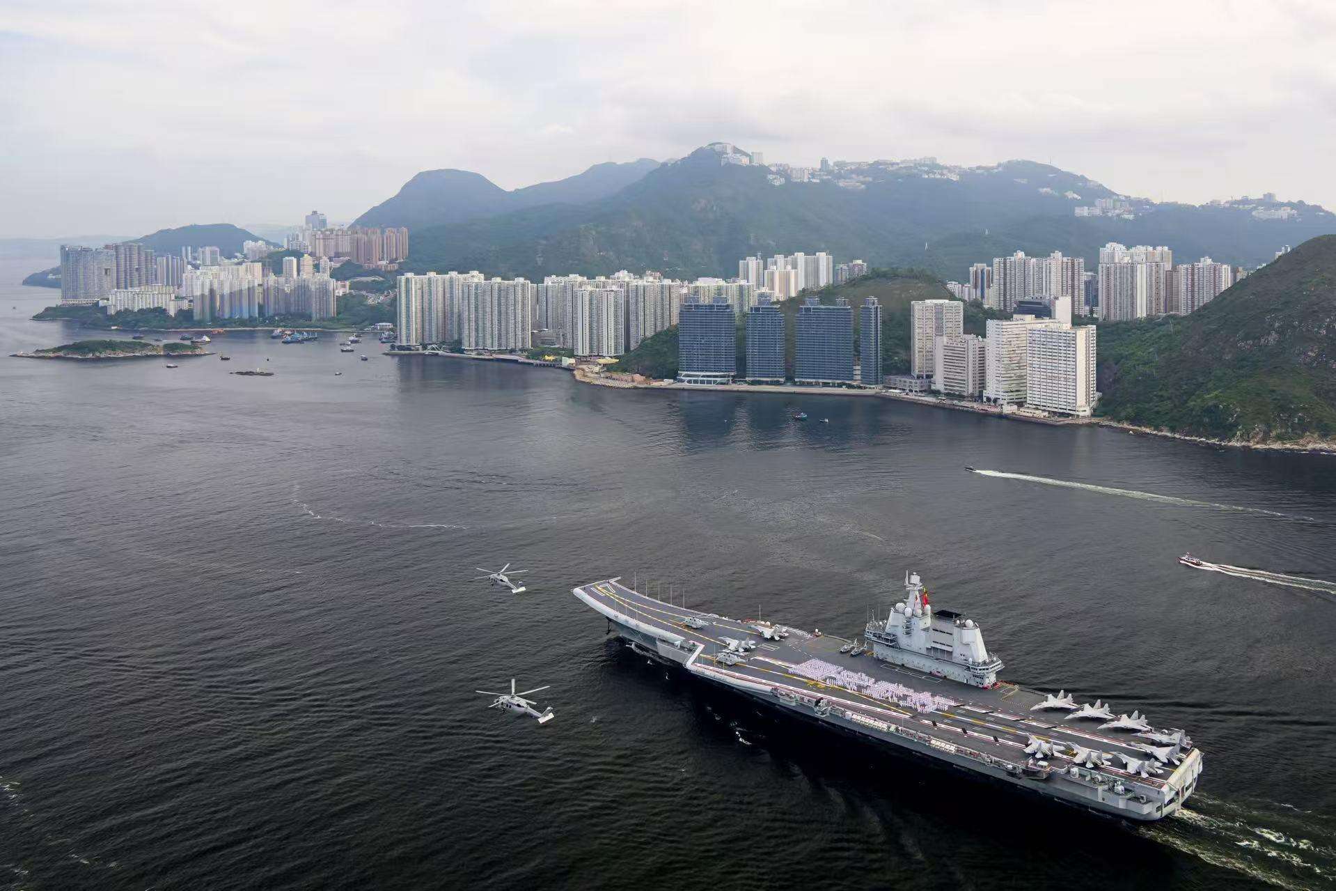 这是继2017年辽宁舰访港后,国家航空母舰再度驶入维多利亚港。此次访问的山东舰,是中国首艘完全自主设计、建造、配套的航空母舰,标志着中国海军发展迈入新阶段。