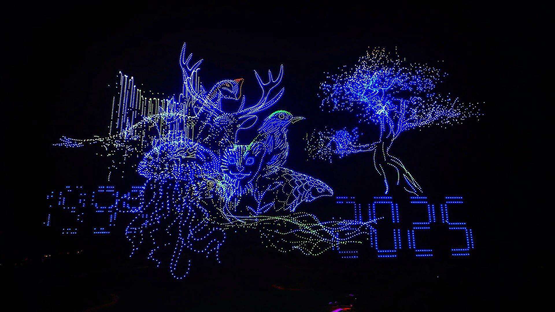 “生态长卷 青山绿水30年”篇章里,无人机群铺展成万顷碧色长轴,大坝、青山、生灵等元素次第呈现,从1995到2025的30年光阴,在万架无人机的光影流转中缓缓铺陈。