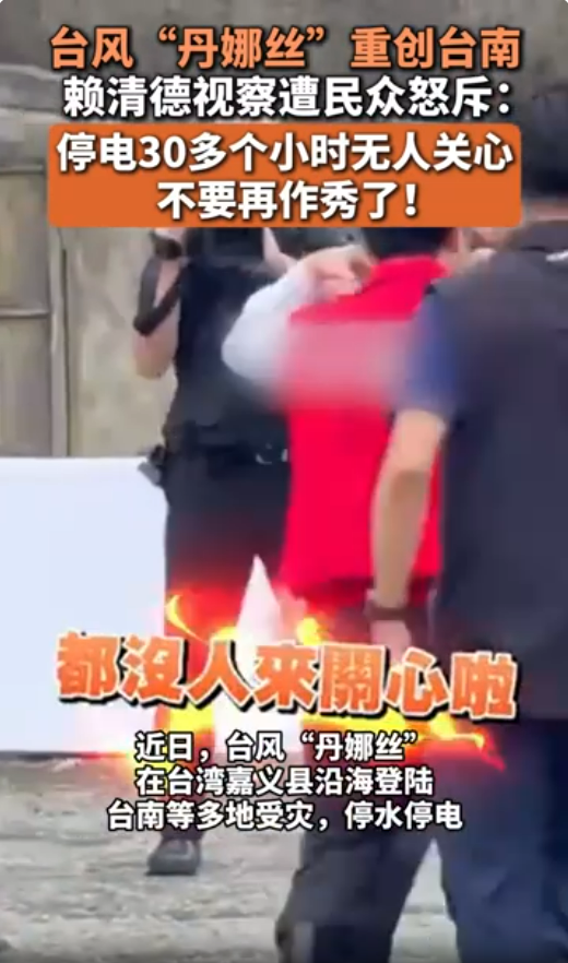 更具讽刺意味的是,赖清德嘴上说“与民众同行”,行动却与之相悖。有饱受台风“丹娜丝”之苦的民众反映,家里停电5、6天求助无门,晚上只能靠点蜡烛度日。还有报道称,赖清德日前至台南七股勘灾时与一名家里漏水的受灾群众对话,赖清德说:“没关系,帆布那边有。”灾民是一位年长男性,他表示:“不敢爬上去(屋顶)。”赖清德却回应:“喔,不敢爬上去喔。没有啦,我们要自己爬啦。”随后,岛内便传出有81岁老翁爬屋顶跌倒丧命的消息。此外,在社交平台发布的一段现场视频中可以看到,赖清德面对民众陈情诉苦,赖清德仅挥手致意,未作任何回复,便转身离去。