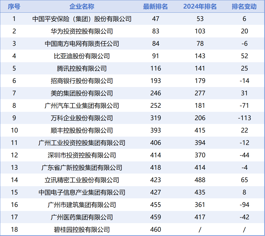 A total of 18 companies from Guangdong province appeared on the 2025 Fortune Global 500 list, one more than last year. Ping An Insurance, Huawei Investment & Holding, China Southern Power Grid, and BYD all ranked within the top 100, with BYD making the top 100 for the first time. These 18 Guangdong-based companies cover a wide range of industries, including automotive, electronic information, home appliances, internet, real estate, and finance. By city, Shenzhen had 9 companieson the list, Guangzhou had 6, Foshan 2, and Dongguan 1.