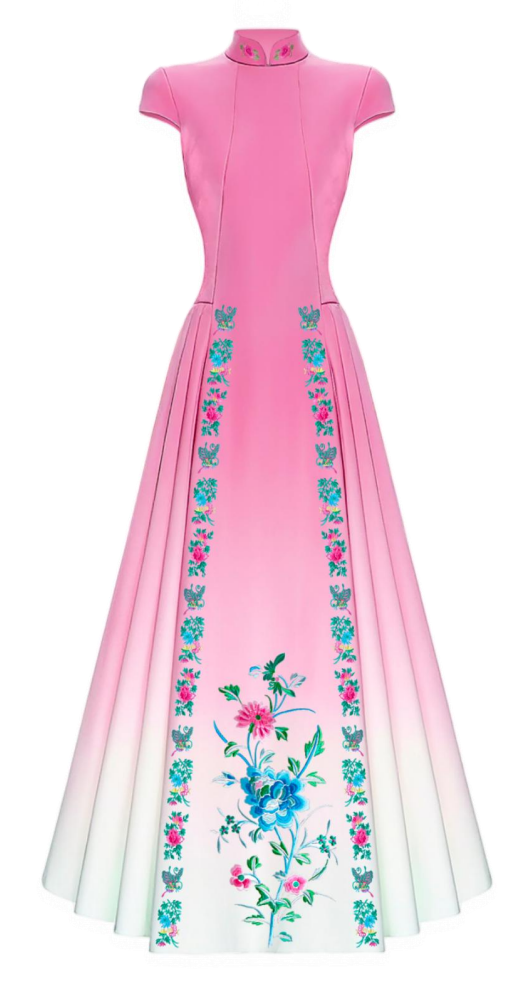 十五运会和残特奥会颁奖礼服以马面裙为核心设计语言,其中,礼仪服裙身上的牡丹花图案是一大亮点。裙门图案的设计灵感来自粤绣“一枝独秀”,隐喻了运动员在全运会上的卓越表现。刺绣图案采用三蓝绣工艺,象征大湾区三地和谐繁荣、开放包容、生态文明的特色。