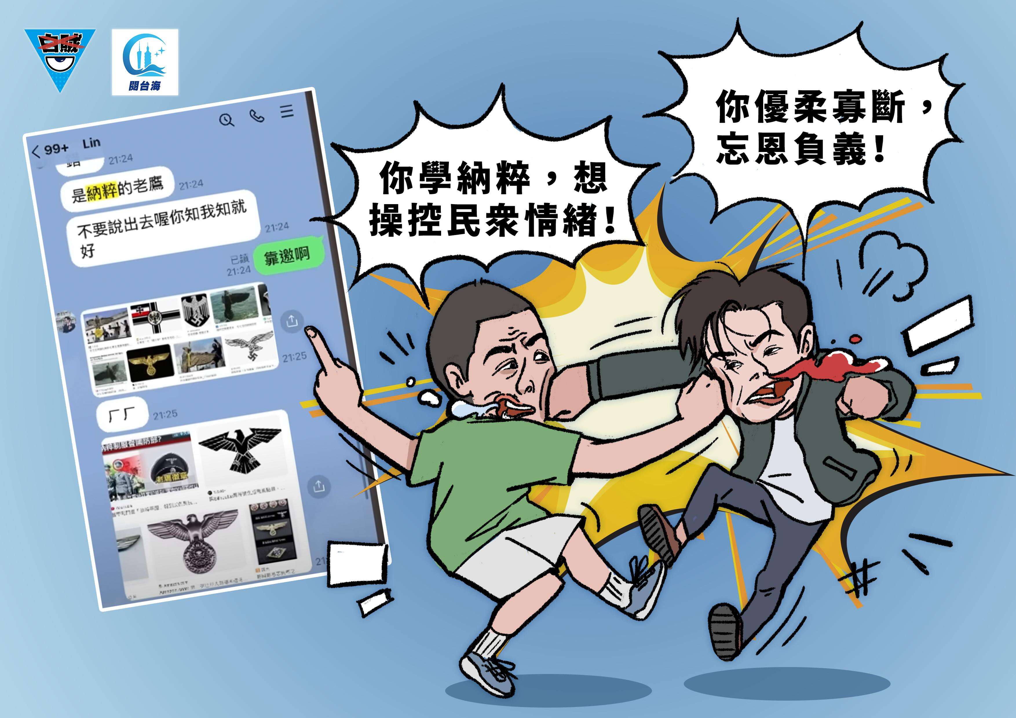 近日,“台独”网红“闽南狼”与“八炯”闹翻。“闽南狼”在网络上发布一段视频,称“八炯”在大罢免期间,曾与他讨论如何效仿“纳粹”操控民众情绪,更表示“要找一个群体变成犹太人,然后煽动,还要发明新手势”。“闽南狼”称,4月的一场游行前,“八炯”传给他多张纳粹老鹰图样与希特勒军徽图像作参考,并交代他不要说出去。“这些作为已背离初衷”,“闽南狼”直言无法接受,呼吁支持者拒绝盲从、拒绝极端。