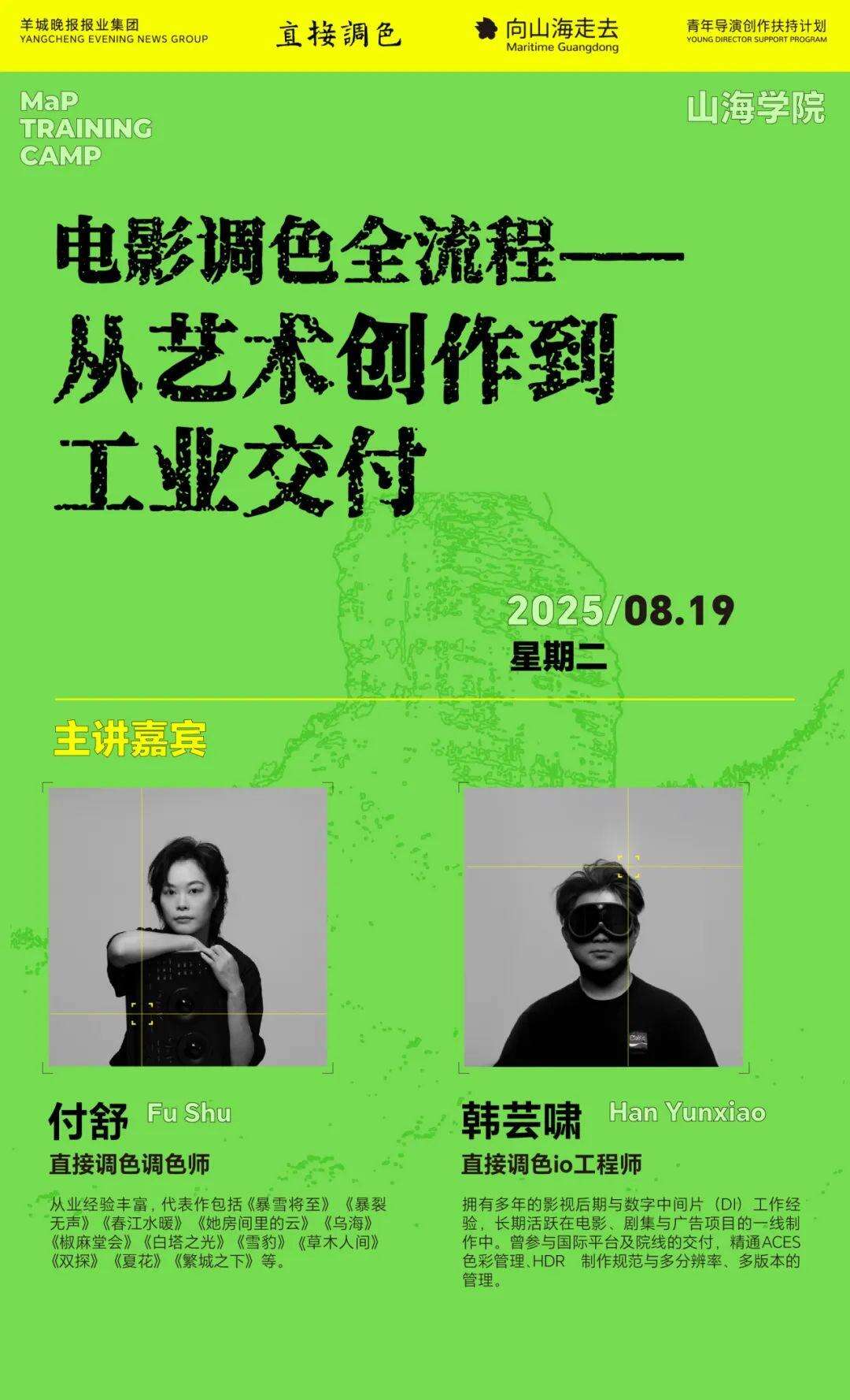 今年,合作再续新篇——8月19日(周二)下午14时,“山海学院”将特邀“直接调色”旗下知名调色师付舒与io工程师韩芸啸联袂带来专题讲座——《电影调色全流程:从艺术创作到工业交付》。本次讲座将系统解析电影调色的核心技术与艺术表达,涵盖创意构思到最终技术交付的完整环节,为创作者揭示专业调色的奥秘。