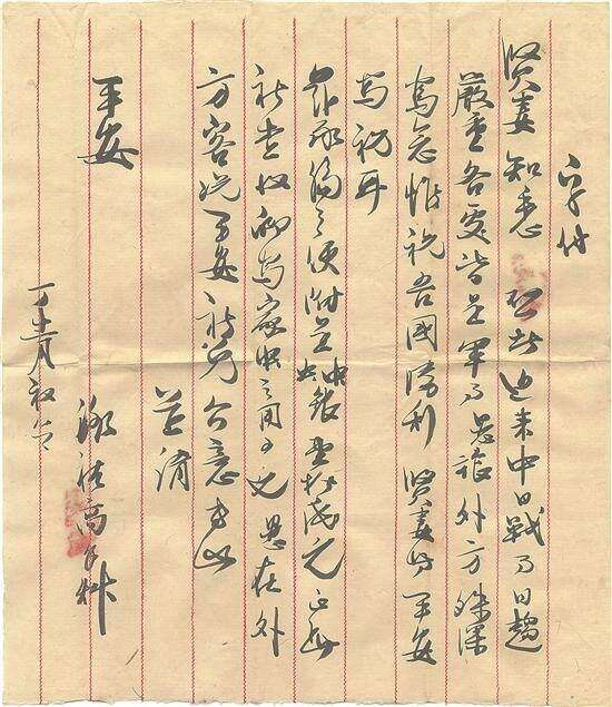 惟届时仍望大人审察情形,比较若妹处(即后洋堤)与义君处,哪一处更为安全,事前先为调遣妇孺前往,庶免临时怆悴也。如已安顿清楚,并祈将经过情形,寄邮政或飞机信告男,是所至祷。