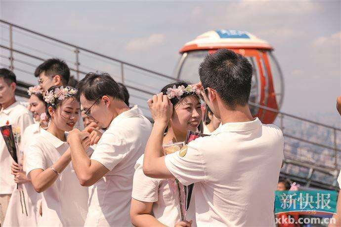 “最好的风景在眼前,最爱的人在身边。”8月29日是“七夕”佳节,在450米的广州塔城市之巅,15对新婚夫妇身着运动风婚服举行集体婚礼,许下一生一世的诺言。