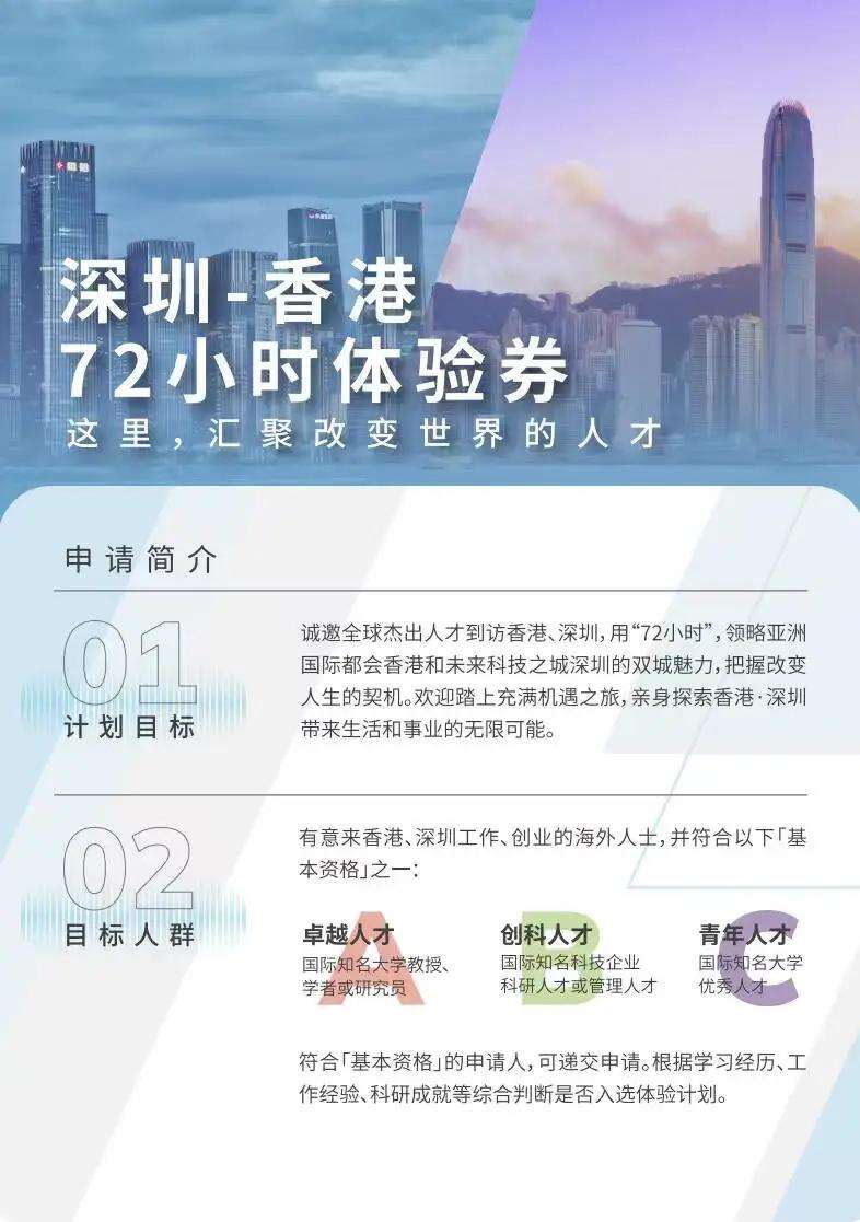 “深港72小时体验券”的目标使用人群是“有意来香港、深圳工作、创业的海外人士”,并重点聚焦“卓越人才、创科人才和青年人才”三大群体。