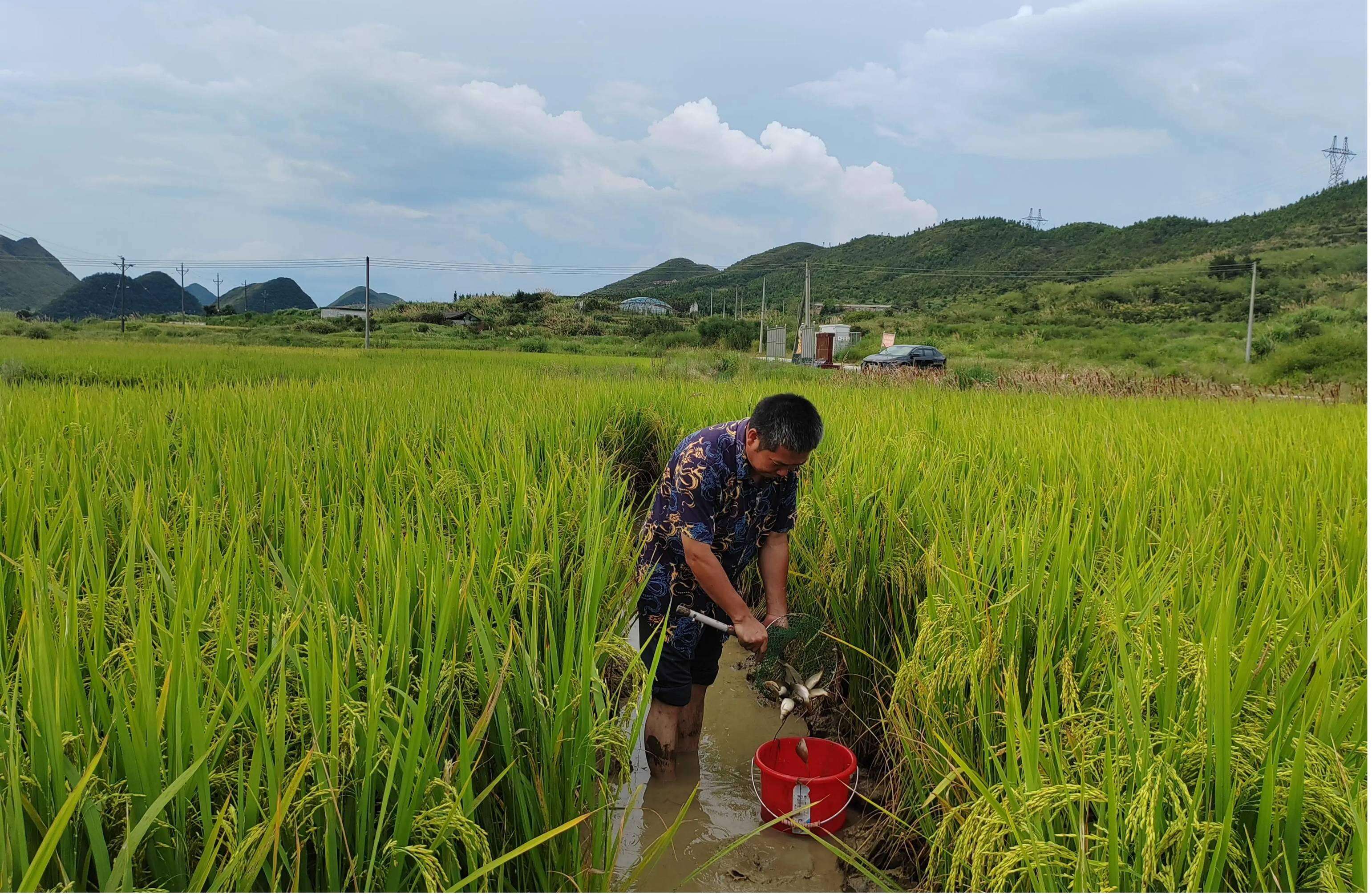 Lingnan: Beauty Beyond Borders | In Zhongchong, Hetaoshan, Sanyuan, and other villages of Daqiao Town, Ruyuan Yao Autonomous County, Shaoguan, endless rice fields ripple with golden waves. Villagers and tourists cheerfully catch fish while combines harvest the ripe grain, creating a picturesque mountain landscape adorned with layers of golden rice waves. #SplendidLingnan