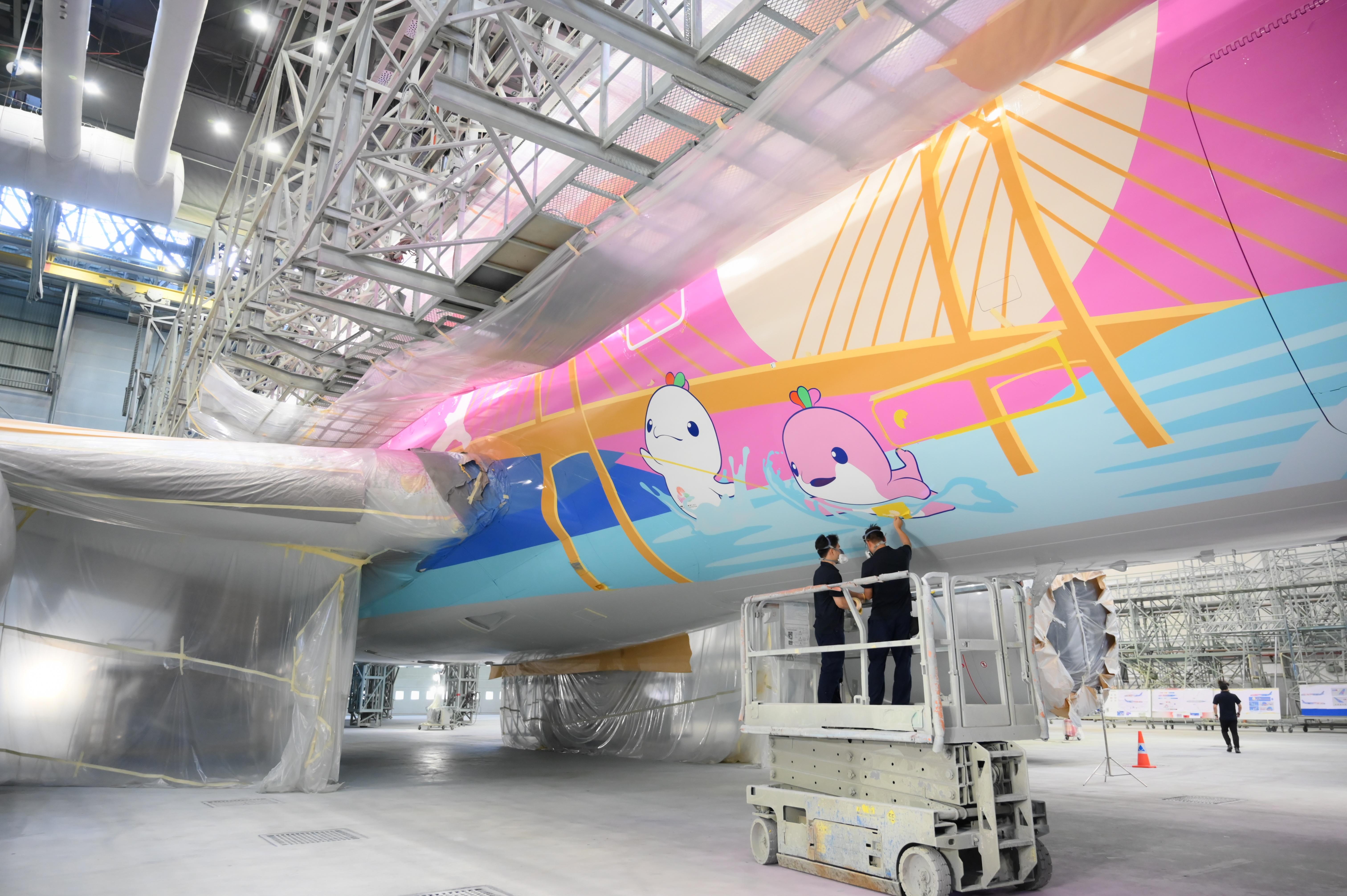 本次活动的主角——南航“活力湾区”号,选用空客A350宽体客机进行喷绘,于8月27日进场,计划于9月15日完工,9月19日正式亮相。机身彩绘以“活力湾区 跃动世界”为主题,画面主体由港珠澳大桥、十五运吉祥物“喜洋洋”和“乐融融”、翱翔的海鸥和昂首怒放的木棉花共同构成。