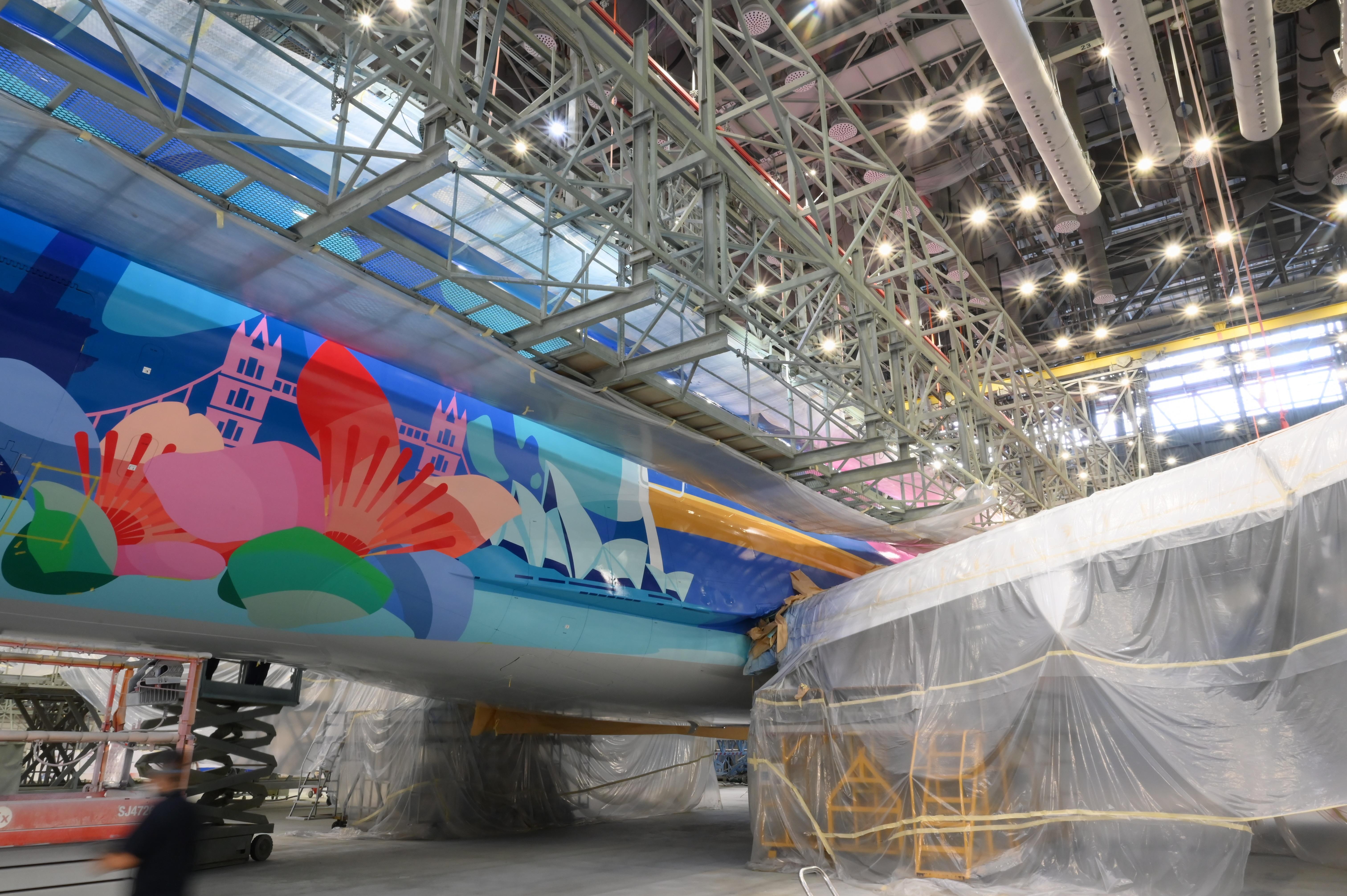 “活力湾区”号所在的GAMECO喷漆机库,拥有领先亚洲的技术实力,全封闭式设计配备先进的通风及温湿度控制系统,最大可容纳三架窄体机同时作业。