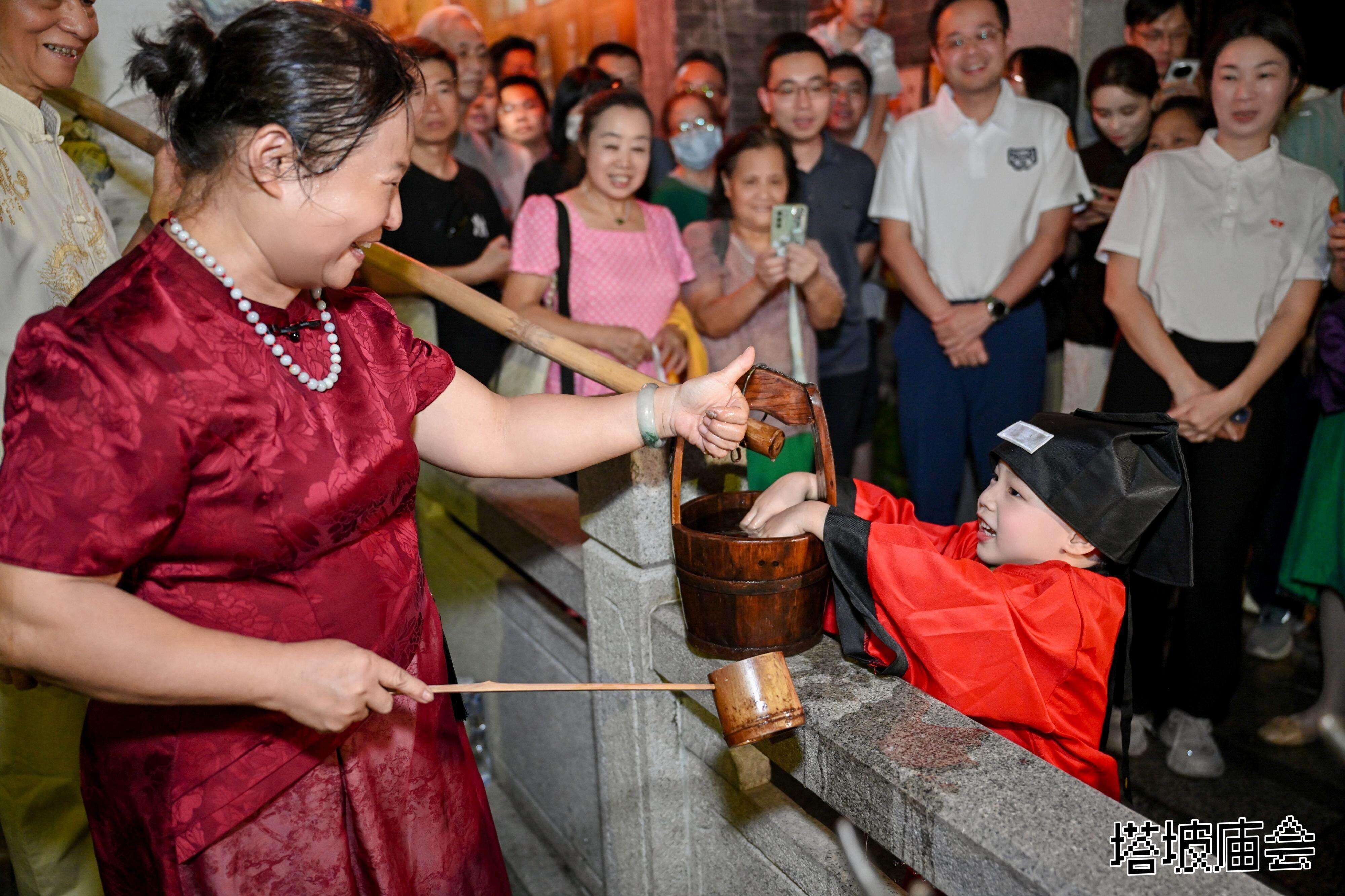 随着一声“起水咯”,清凉的塔坡水从古老的塔坡井取出,塔坡庙会的重头戏——“顺水仪式”开始。由原住民、非遗代表性传承人、华侨、商界代表、老字号代表及学生组成的六大方阵,在5米长超大鱼灯的引领下,接力将象征“顺风又顺水”的塔坡水传至兆祥公园,汇入福泽容器。庄重的“顺水仪式”寓意文化源流绵延不绝,寄托着佛山市民对美好生活的共同向往和祈愿。沿途市民纷纷驻足观看,感受传统仪式与城市记忆的交融。