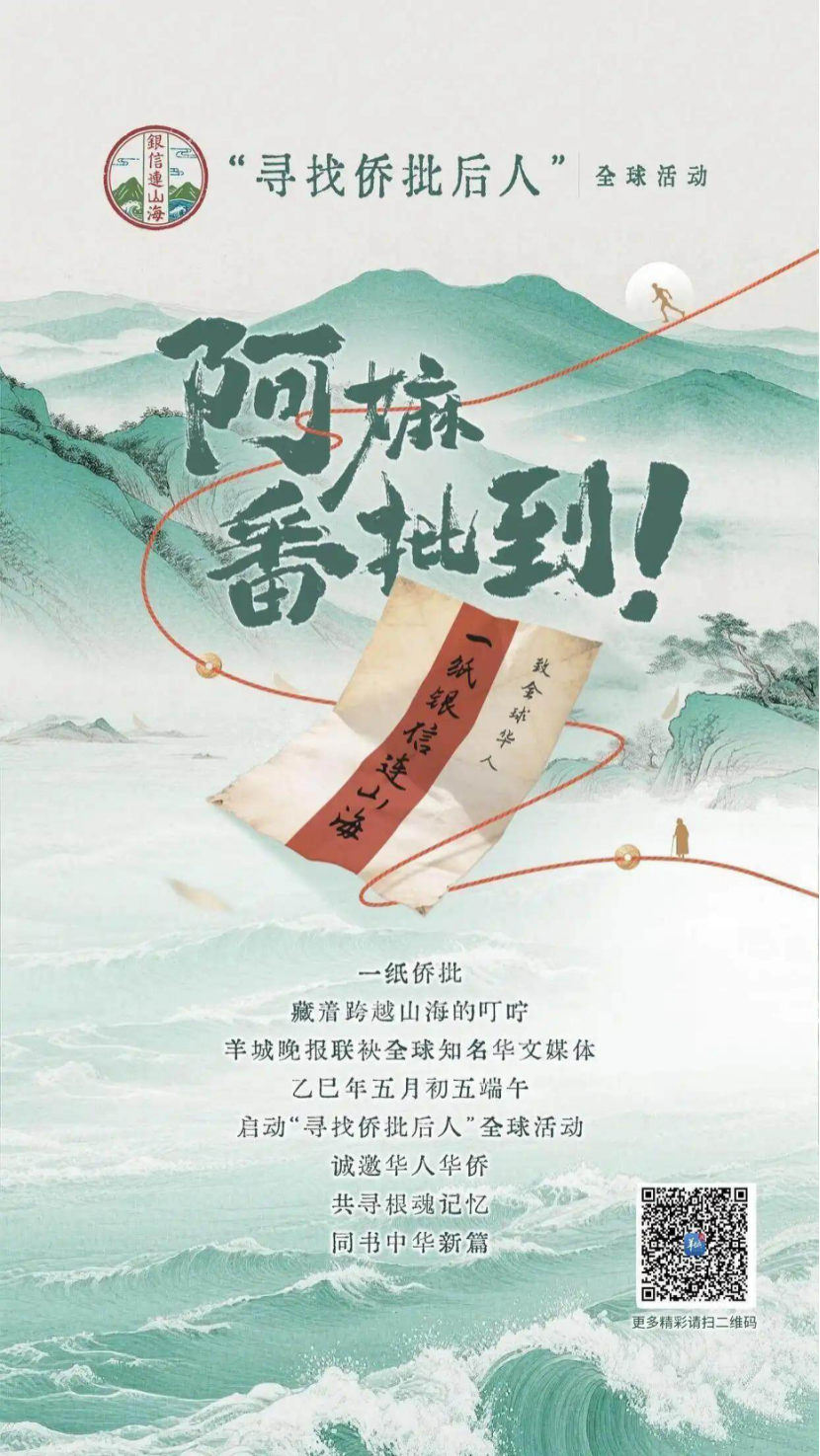今年是中国“侨批档案”入选联合国教科文组织“世界记忆名录”十二周年。一纪春秋,岁序重开,在广东省政府侨务办公室指导下,羊城晚报发起“寻找侨批后人”全球主题活动,携手全球著名华文媒体,在海内外开展线索征集、寻踪探访、征文创作等活动,重温侨批里的家国情怀,聚焦华侨后人的勠力奋斗,续写新时代的中华故事。
