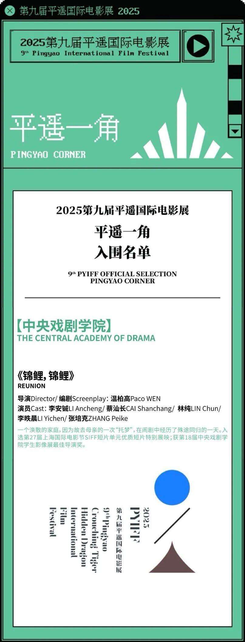 由“向山海走去”青年导演创作扶持计划(简称山海计划)扶持拍摄、青年导演温柏高执导的短片《锦鲤,锦鲤》(REUNION)入围第九届平遥国际电影展“平遥一角”单元,并将于9月25日下午14:30在平遥电影宫4号厅进行放映。