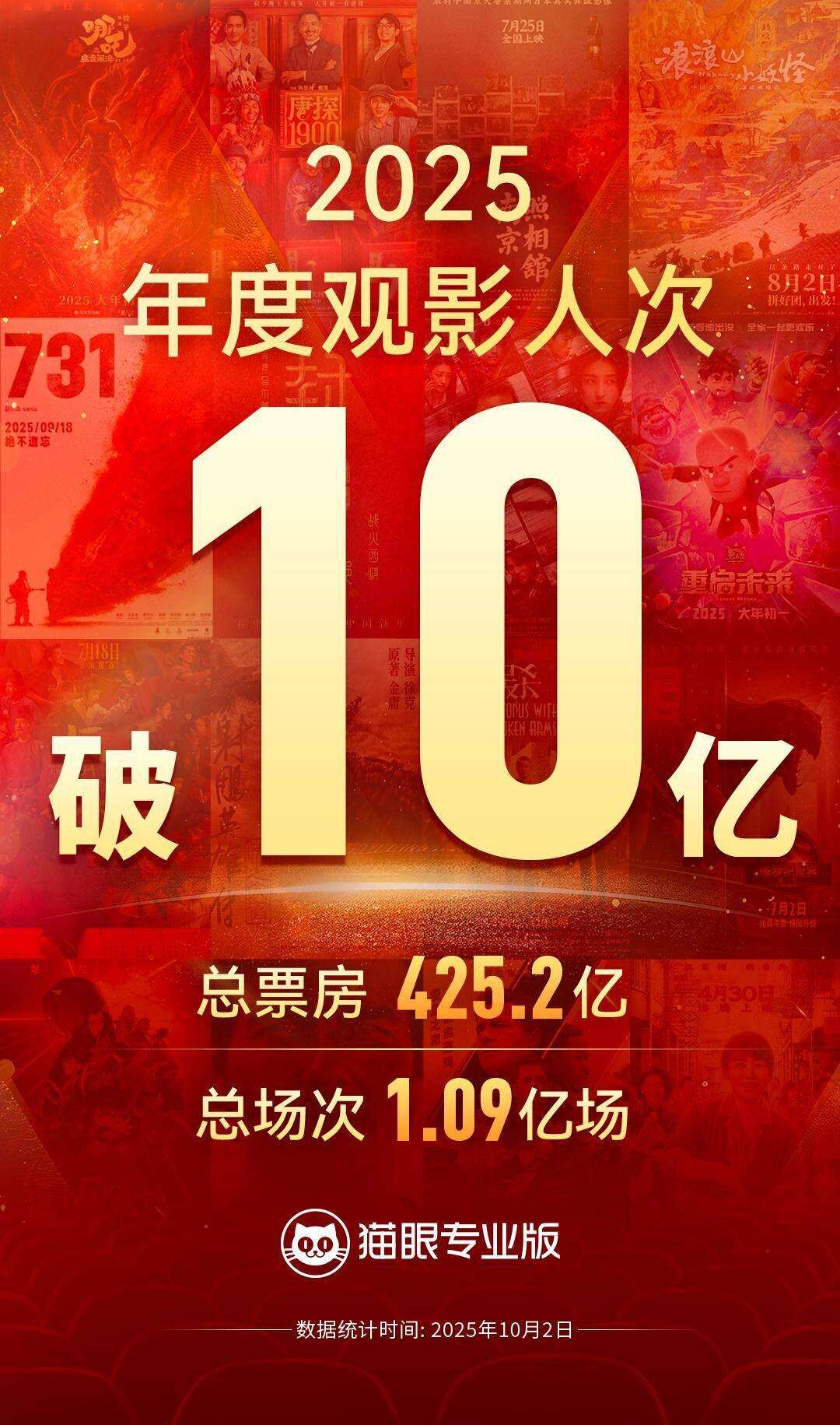 据中国票务平台猫眼专业版数据,截至2025年10月2日15:30,2025年度总观影人次破10亿,总票房425.2亿元,总场次1.09亿,平均票价42.5元,2025年度总票房已超去年全年。