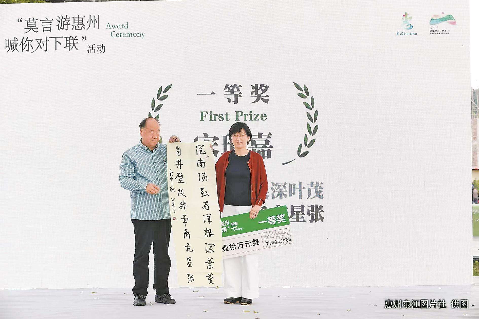 羊城晚报全媒体记者李海婵摄影报道:今年6月,诺贝尔文学奖得主莫言在惠州参观百年客家围屋碧滟楼时,有感而发,写下“从南阳到南洋根深叶茂”十个字作为上联,并向广大文学爱好者公开征集下联。10月20日,在环南昆山—罗浮山引领区主题采风活动及古榕文学村系列活动中,“莫言游惠州,喊你对下联”征集结果正式揭晓。来自北京的21岁研究生宋珂嘉所对的下联“自井壁及井毕角亢星张”,获一等奖,并得到专家高度评价。