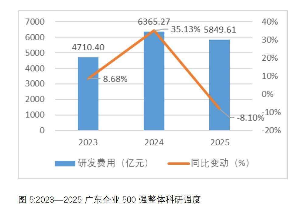 2025广东企业500强企业研发投入结构优化,研发费用总额达到5849.61亿元。优化主要源于三方面:其一,全球科技竞争加剧,企业加强在人工智能、新能源、生物医药等前沿领域的布局;其二,政策引导持续完善,激发企业创新投入意愿;其三,创新体系开放程度提高,企业研发效率与成果转化水平不断提高。