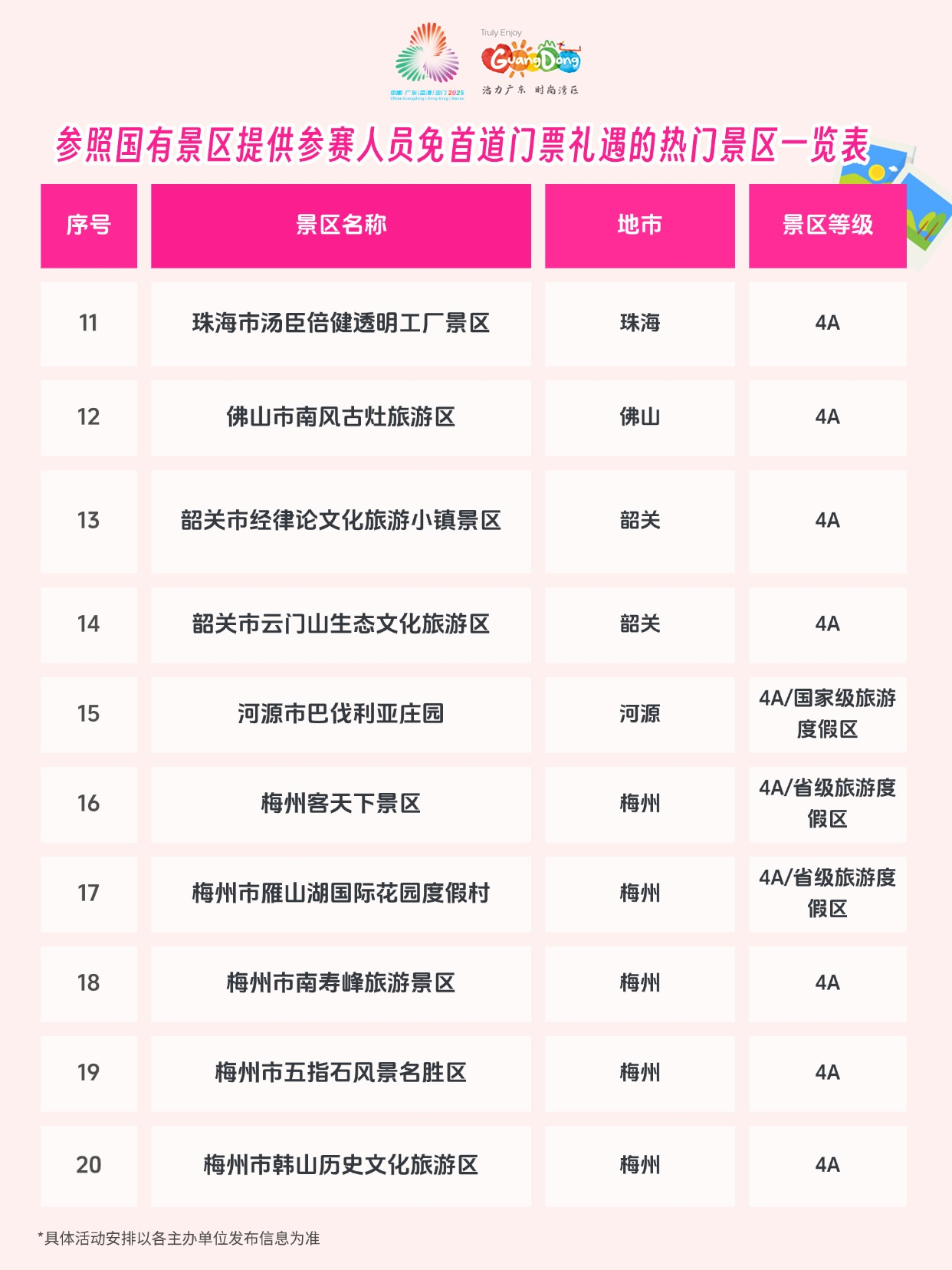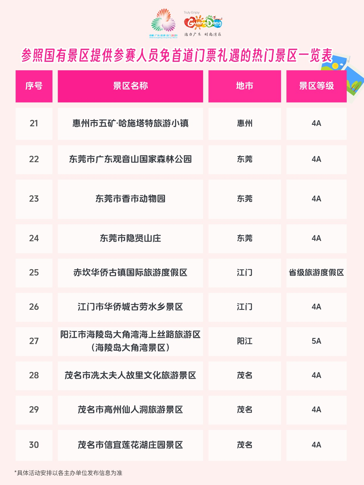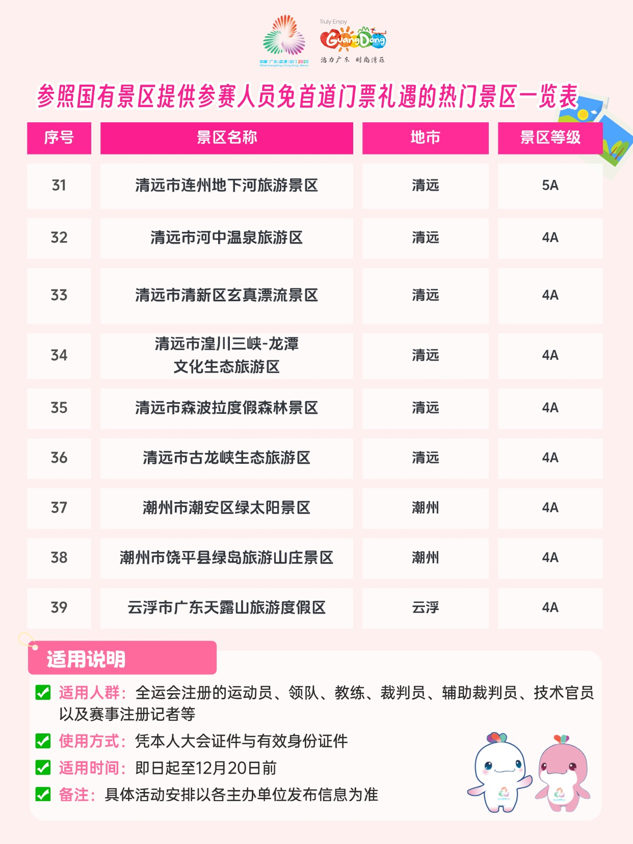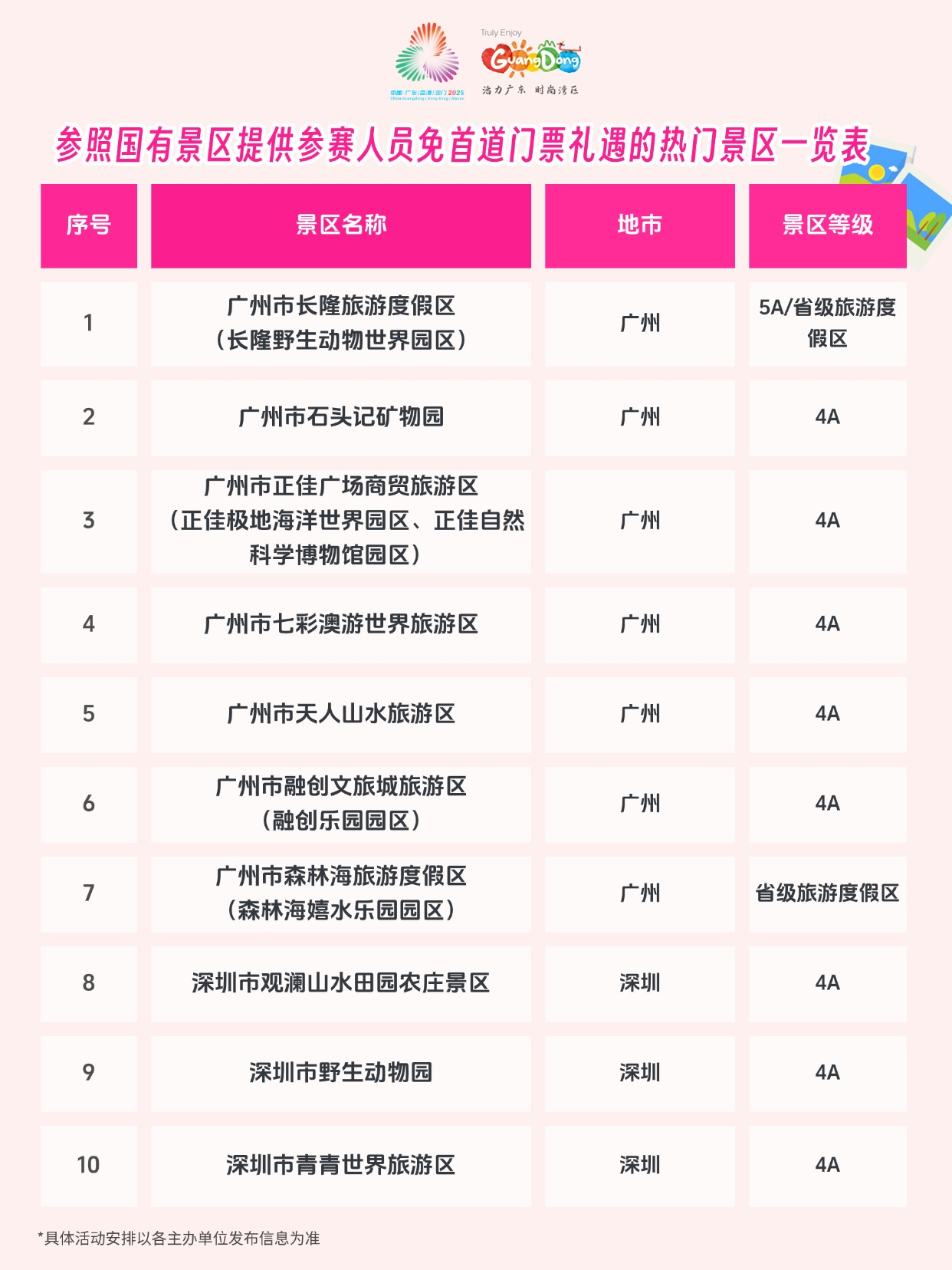 除国有景区外,省内近40家高人气的旅游景区及省级以上旅游度假区也积极响应,为参赛人员提供同等的首道门票免费礼遇。从广州长隆野生动物世界的奇趣探索、融创乐园的欢乐体验,到阳江海陵岛大角湾景区的碧波银滩、江门赤坎华侨古镇的侨乡风情,再到清远连州地下河的溶洞奇观、古龙峡旅游区的飞瀑激流,让参赛健儿在激烈赛事之余,能够漫步岭南山水,品味人文底蕴,在广东留下一段“赛时全力拼搏,赛后自在畅游”的难忘记忆。