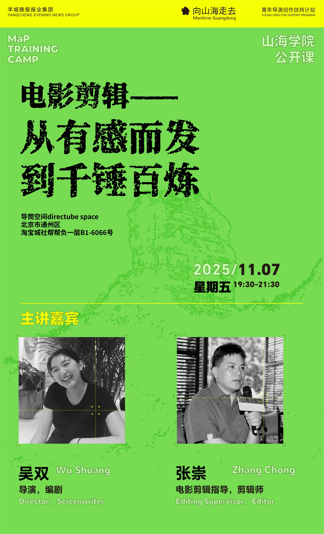 2025年11月7日19:30,“山海计划”与联合深度电影媒体合作伙伴「导筒directube」在北京导筒空间为大家带来「山海学院」系列公开课——《电影剪辑——从有感而发到千锤百炼》,主讲者为深耕电影行业多年的剪辑指导张崇老师,特邀嘉宾为电影《百川东到海》导演吴双。