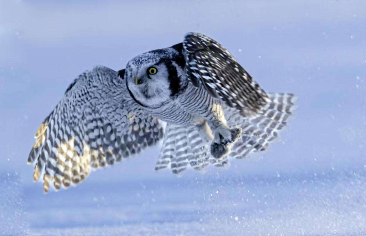 雪鸮是鸱鸮科雕鸮属的大型猫头鹰,翼展可达147—159厘米。雪鸮是肉食性动物,头部可旋转270度,利用高度协调的听觉和视觉观察狩猎区域,猎捕迅猛凶狠。