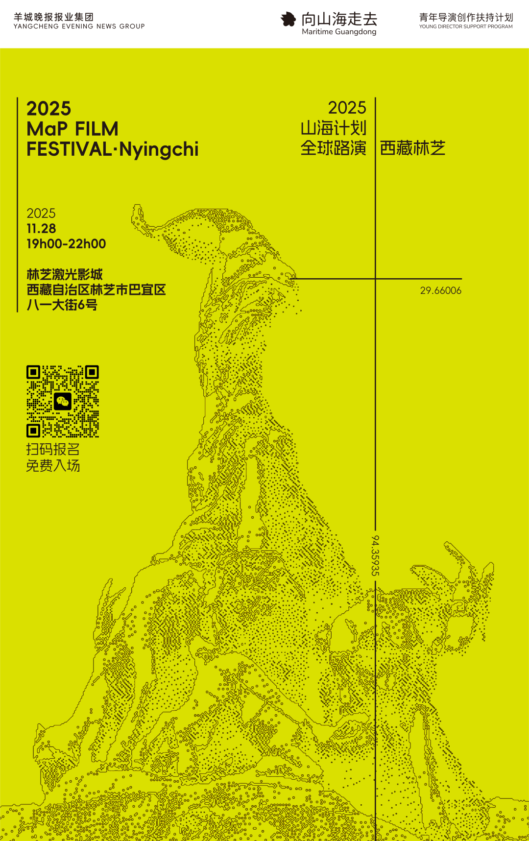 11月28日,由羊城晚报报业集团主办的“向山海走去”青年导演创作扶持计划(山海计划)将走进西藏林芝,为当地观众带来一场别具岭南风情的青年电影展映。此次活动免费开放,将集中呈现6部由山海计划扶持、在粤港澳大湾区取景取材的优秀短片。这些作品已多次亮相国内外主流电影节展,展现了华语青年导演的独特视角与创作实力。