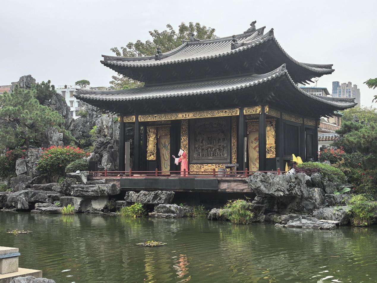 亭台楼阁,引出长长迴廊。水中舞台,再现当年场景。邻水而建的博物馆,巍峨高大,让人仰视,十分抓眼,一派岭南风味。