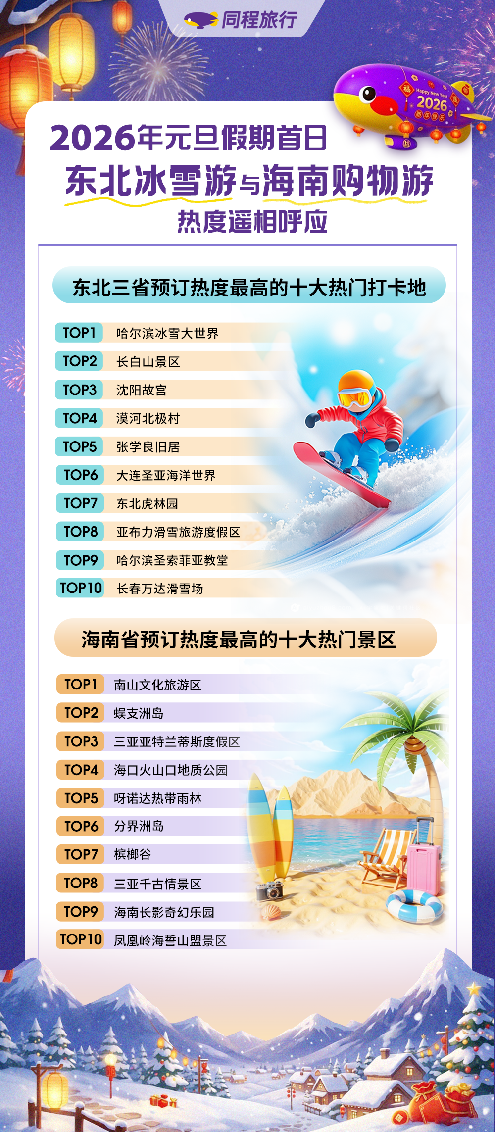 今年元旦,“北上滑雪、南下避寒购物”成为许多游客的选择。同程旅行报告指出,元旦首日,黑龙江与海南互为热门航线始发地省份,广东位列飞往海南的始发省份TOP5,同时也是飞往东北的重要客源省份之一。