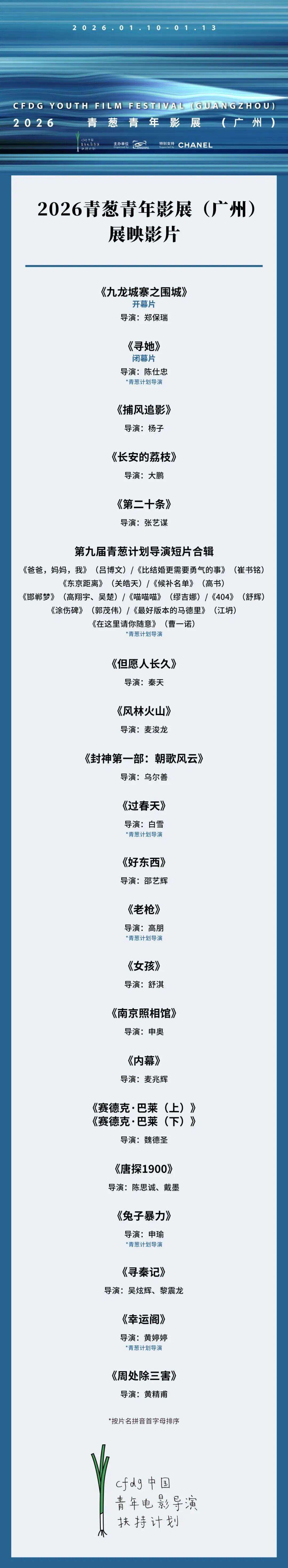 2026青葱青年影展(广州)将于1月10日至13日期间在广州中影国际影城(中船汇店)、白天鹅宾馆举办。本次影展为青葱计划(中国电影导演协会“中国青年电影导演扶持计划”)的展映活动,由中国电影导演协会主办,将展映青葱计划导演作品及《九龙城寨之围城》《捕风追影》《女孩》《赛德克·巴莱》《长安的荔枝》《第二十条》等22部影片,呈现近年来海峡两岸及香港电影创作新面貌,为青年电影创作者与资深影人搭建对话平台。