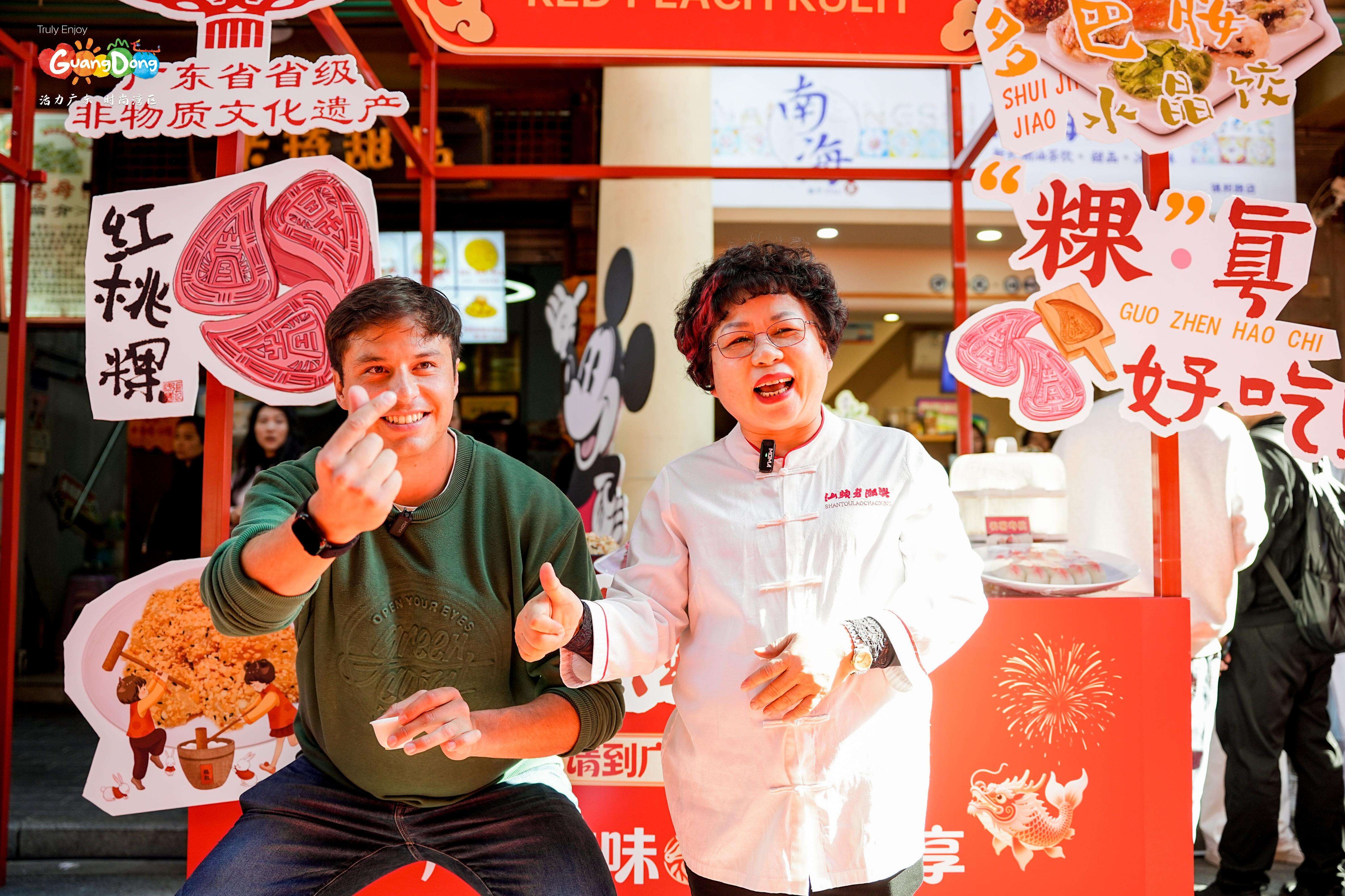 活动现场设置了八大非遗体验区,外籍达人体验潮汕剪纸、油纸灯笼制作、工夫茶冲泡、红桃粿制作等传统技艺。多位在粤工作生活的外籍达人分享了他们的广东年味体验——从学写春联、体验舞狮到品味地道卤鹅,真挚的讲述让“广东年味”更富感染力。